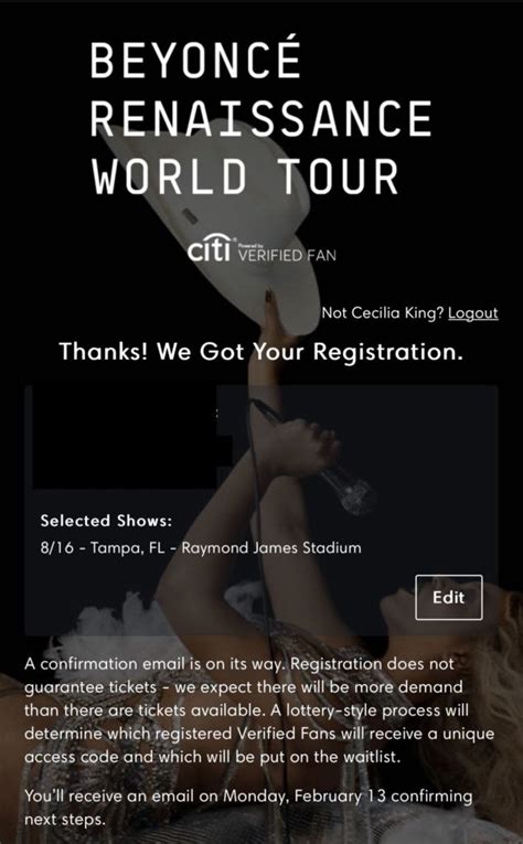 Getting selected as a verified fan can be a competitive process, but don't get discouraged if you're not chosen right away. Keep participating in fan activities, engaging with Beyonce's content, and trying for future pre-sales. Your dedication will eventually pay off!